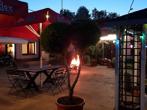 - Biergarten mit kleiner Rutsche und großer Wiese für Kinder