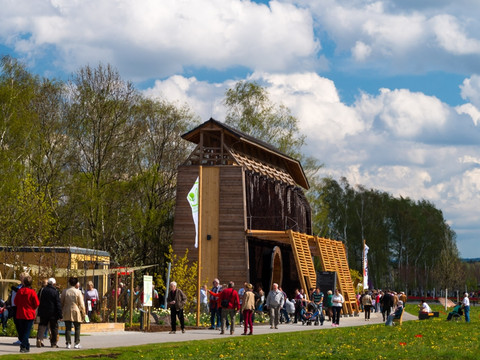 Landschaftlich reizvoller Rundweg mit Schautafeln zum Glückauf-Aussichtsturm, durch Haldenwälder und Gradierwerk im Gartenschaugelände in Oelsnitz/Erzgebirge.