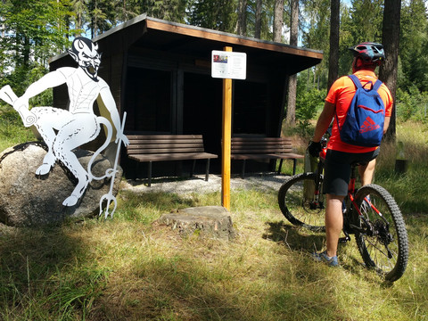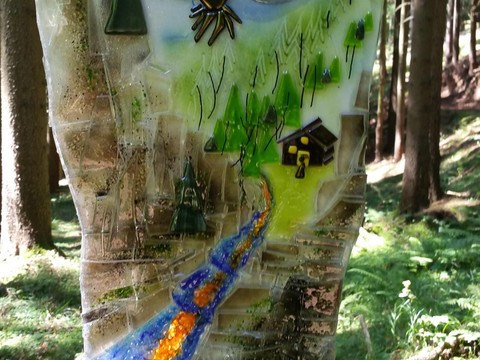 An jedem Standort eine A4-Tafel aus Edelstahl, Befestigung an einem Wanderwegepfahl neben der Skulptur. In Anlehnung an die Sage des Hüttenmatths ist ein Rundweg mit folgenden Stationen entstanden, der sich auf die Orte der Sage bezieht: - Lange Hütte in der Saigerhütte Olbernhau Grünthal (UNESCO-Welterbe-Bestandteil) - am Kupferhammer - Eingang Hüttengrund - im Wald zwischen Hüttengrund und Kaltem Kober - Kreuzung Hand - Tiefer Graben Wegeverlauf: An der Langen Hütte im Saigerhüttengelände beginnt der mit grünem Punkt markierte Rundwanderweg. Vorbei am Kupferhammer folgen wir der Markierung in Richtung Hüttengrund. Die Straße und die Flöha werden gequert. Der Weg führt durch den Hüttengrund in Richtung Kalter Kober. Dabei werden drei Stationen mit Schnitzarbeiten und bildlichen Darstellungen passiert. Der Weg führt weiter bergauf zur Kreuzung "Hand", wo ein weiteres Objekt aufgestellt ist, nach ca. 50m auf dem Weg zurück biegt man nach links in den Dürren Holzweg ein. Dort passiert man zwei Ausstellungstücke von Manuela Stock zu Thema Hüttenmatts. Vom Dürren Holzweg biegt man nach rechts in Richtung Tiefer Graben ab. Der Weg führt bergab, bis man im Tiefen Graben den KAMMweg erreicht. Diesem folgt man nach rechts in Richtung Kirchweg/ Waldrand. Dort hat man einen sehr schönen Blick auf Olbernhau. Zwei weitere Objekte aus Glas wurden bis dahin passiert. Dem KAMMweg und der Markierung grüner Punkt folgen wir bis ins Saigerhüttengelände. Zuvor wird die Oberneuschönberger Kirche passiert. Dort hat der Schnitzer Hans Lichtenberger einen Hund mit Hündehütte für den Sagenweg beigesteuert. Markierung: grüner Punkt Stationen: - Lange Hütte : Metallhund (Schmiedestädte) - Hüttengrund / Preißlerberg: Skulptur mit Hammer und Eule samt Wegweiser (Markus Baumgart) - Hüttengrund : Dielendruckgemälde „Zarenritt“ (Hannes Schaller / Sven Körner) - Kalter Kober : Wirtshausbank mit Hüttenschänke (Markus Baumgart) - Kreuzung Hand : Teufel wartet auf Matthes (Laser-Tech Olbernhau GmbH) - Dürrer Holzweg : Betonstehle Pakt in "Blut" geschrieben (Manuela Stock ) - Dürrer Holzweg Abzweig Tiefer Graben : Skulptur „Der unglückliche Matthes“ (Manuela Stock ) - Tiefe Graben – Abzweig KAMMweg : Glasbild Natzschungstal und Haus im Wald (Frau Meinke) - KAMMweg zwischen Kirchweg und Tiefen Graben : Waldfrau „Die Alte“ ( Markus Baumgart ) - Kirchweg Waldrand : Kampf der Alten mit dem Teufel (Frau Meinke) - Oberneuschönberger Kirche : Skulptur Hund mit Hundehütte (Hans Lichtenberger) Wegezustand: gut ausgebauter Wanderweg, teilweise Asphalt Sehenswürdigkeiten am Weg: Saigerhüttenareal mit Kupferhammer Kreuzung "Hand" Gastronomie am Weg: Hotel Saigerhütte Bowlingbahn Olbernhau
