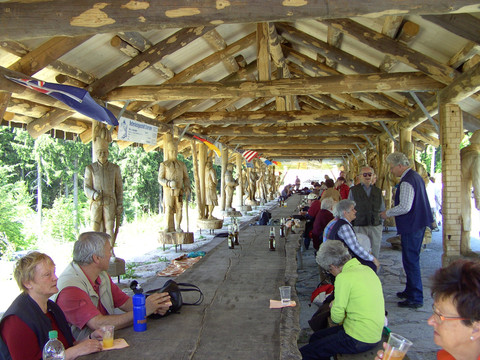 Die Wanderung startet in Friedebach am Café Dahmen und führt zunächst 200 m entlang des Rad-und Wanderweges. Die B 171 überquerend geht es in Richtung Waldrand zum Rastplatz „Kreuztannenblick“ und über den Dorfchemnitzer Weg gelangen wir zum Gasthaus „Alte Mühle“ in Voigtsdorf. Nach einer stärkenden Rast gehen wir einen ansteigenden Weg zur kleinen Ortschaft Wolfsgrund, mit ihrem „Landgasthof Wolfsgrund“. Über die „Drei Häuser“ gelangen wir zum Eisenhammer Dorfchemnitz. Technisches Museum und Schauschmiedevorführungen lassen den Besuch zu einem Erlebnis werden. Weiter geht es hinauf über die Buchleite bis zum Naturdenkmal Marderlinde. Und schon sehen wir über einem Tal liegend Blockhausen, die Wirkungsstätte des Sauensägers Andreas Martin. Mitten im Wald ist eine große Holzskulpturensammlung der weltbesten Kettensägenkünstler zu sehen, die in Deutschland wohl einzigartig ist. Der Rückweg führt über den Mordsteinweg und die Geleitstraße hinunter nach Dorfchemnitz. Über den Unteren- und Oberen Seitenweg im Dorf geht es zum Rad-und Wanderweg, der uns wieder zurück zum Startpunkt der Wanderung nach Friedebach führt. Alternativ kann ab Haltestelle Wolfsgrund oder „Gasthaus Palme“ der Linienbus genommen werden.
